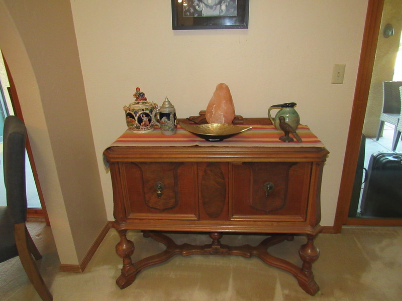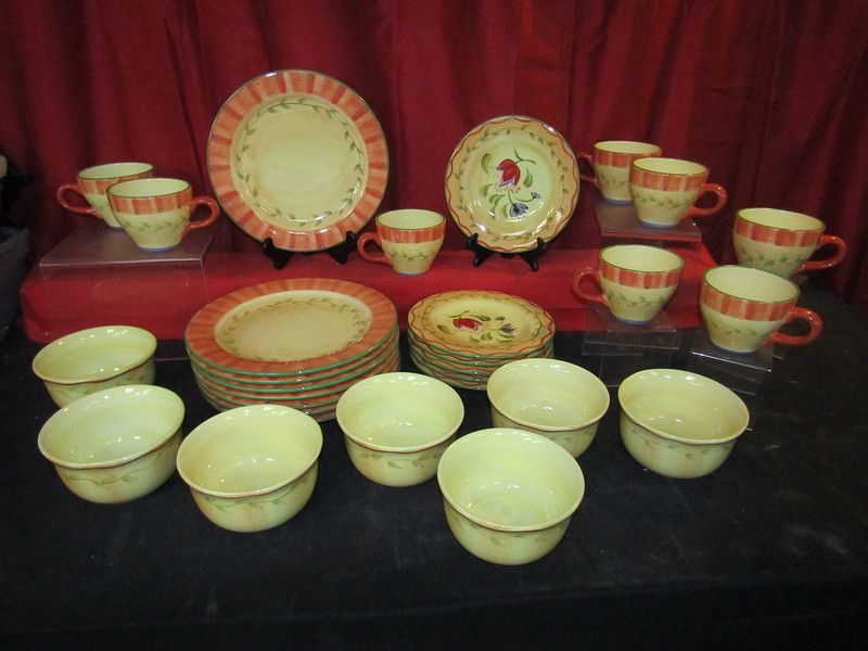 Work bench, end table, king headboard and footboard, corner cabinet, dresser, chest, desk, chair with ottoman, shelves, coffee table, chairs, TV Stand, cabinets, table, antique table, dresser, tool box, table, with 6 chairs, pig décor, table with 4 chairs, sectional, tools, rocker, dog décor, assorted artwork and pictures, electric sofa, electric recliners, sofa table, coffee table, chair, media stand, pair of lamps, credenza, cart, French horn, desk, floor lamp, assorted lamps, chair with ottoman, table with 4 chairs, Ethan Allen wall unit, Ethan Allen coffee table, Ethan Allen table with 4 chairs, TV cabinet, file cabinet, mini fridge, assorted chairs, bookshelves, nesting tables, Nordic Treadmill, Waterford crystal, Indian pottery, Talavera pieces, 24pc RomerTop Terca Rosa Reco dinner set, 26pc Crate & Barrel “Kathleen Willis” dinner set, 29pc Pfaltzgraff “Napoli” dinner set, bird houses, Beattle records, assorted model home décor, a nice selection of kitchenware including pots and pans, crock pots, baking pans, Corningware, Corelle pieces, Cuisinart coffee maker and so much more!