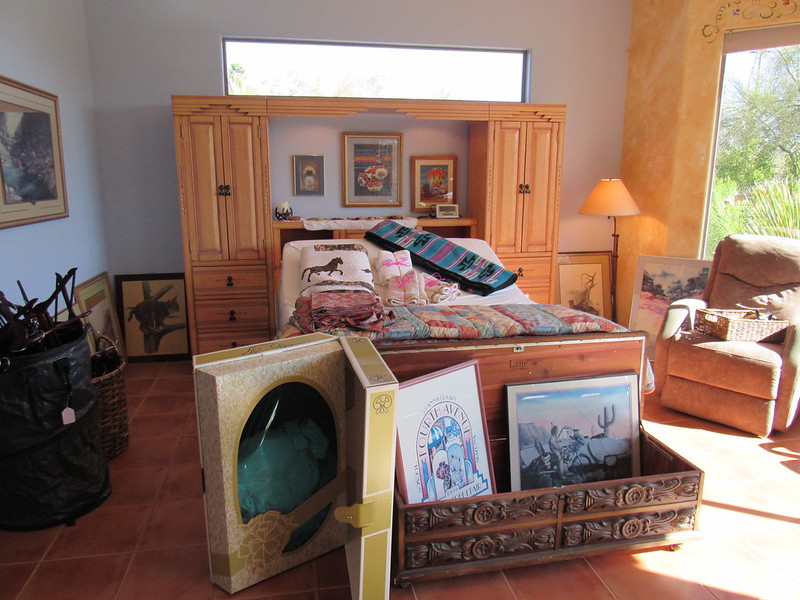 Patio table with 4 chairs and umbrella, patio table with 4 chairs, 5pc patio set, patio bench, assorted chairs, side tables, patio wicker sofa & coffee table, 2 cabinets, patio bar with 4 stools, TV cabinet, sofa table, tall chest, pair of nightstands, cabinet, stereo cabinet, lounge, 2 chairs and ottomans, settee, chair with ottoman, full bedstead, pair of lamps, file cabinet with hutch, L-shaped desk with hutch, area rug, king 4 post bedstead, dresser with mirror, end table, coffee table, assorted pictures and artwork, southwest décor, assorted lamps and floor lamps, assorted pots, rocking chair, bar stools, southwest china cabinet, metal top cabinet, southwest metal floor mirror, southwest bar cabinet, fridge, bookcases, drum, pair of nightstands, southwest bench, table with 6 chairs and 2 leaves, southwest love seat, end table, king bedstead, sofa table, TV cabinet, pool table, TV, chair, desk, shelves, sewing machine, dresser, 3 barstools, décor, TV cabinet, armoire, coffee table, queen bedstead, king bedstead, sofa, love seat, sofa table, table with 8 chairs, end table, dresser, chest, desk, chest, chair, marble top entry table, china cabinet, washer & dryer, queen bedstead, rug, 21pc Narumi tea set, mantel clocks, 56pc Lenox “Autumn” china set, Waterford, Indian pottery, Talavera pieces, Punch bowl set, vintage cast iron door stoppers, Bose System, pots and pans, Overmont Cast enamel pot, Regal Food processor, Keurig, Nesco 18 roaster, 2 Kitchen Aid mixers, coffee maker, toaster oven and so much more!
